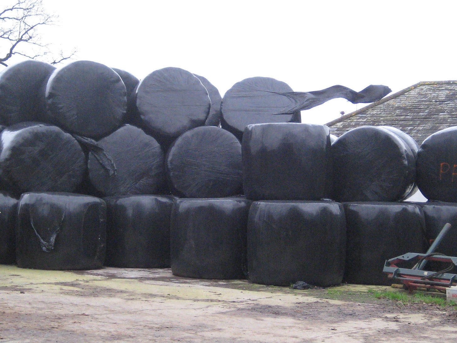 Neatly stacked haylage; you can see how the wind can whip off some of the plastic